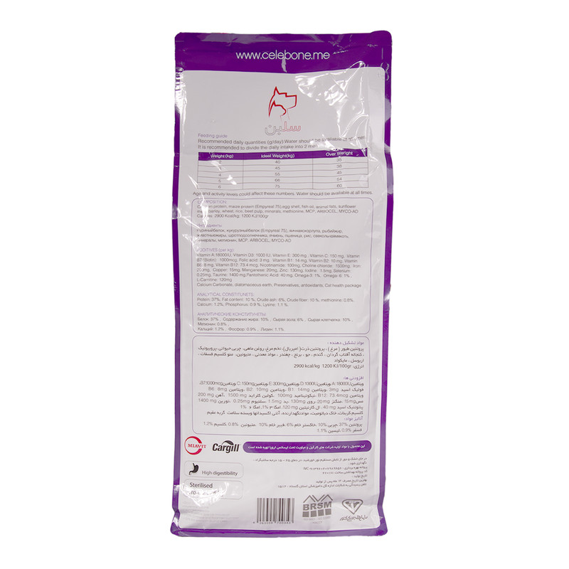 غذای خشک سلبن با کیفیت سوپر پریمیوم مخصوص گربه های عقیم شده می باشد که دارای فرمول کاملا اختصاصی و بالانس شده برای گربه های عقیم شده بسیار مناسب است. این محصول حاوی ویتامین های B - C-D- و امگا سه و شش و ال کارنیتین می باشد که نیاز روزانه گربه های عقیم شده را کاملا تامین می کند . این محصول با فرمولاسیون اختصاصی با خاصیت آنتی هربال همین طور سلامت استخوان ها و مفاصل گربه ها را تضمین کرده و با گوارشی آسان و جذب بالا سلامت گربه شما را به ارمغان خواهد آورد. تمامی محصولات سلبن با مواد اولیه از شرکت کارگیل امریکا و میاویت آلمان تحت لیسانس اروپا تهیه شده است.
